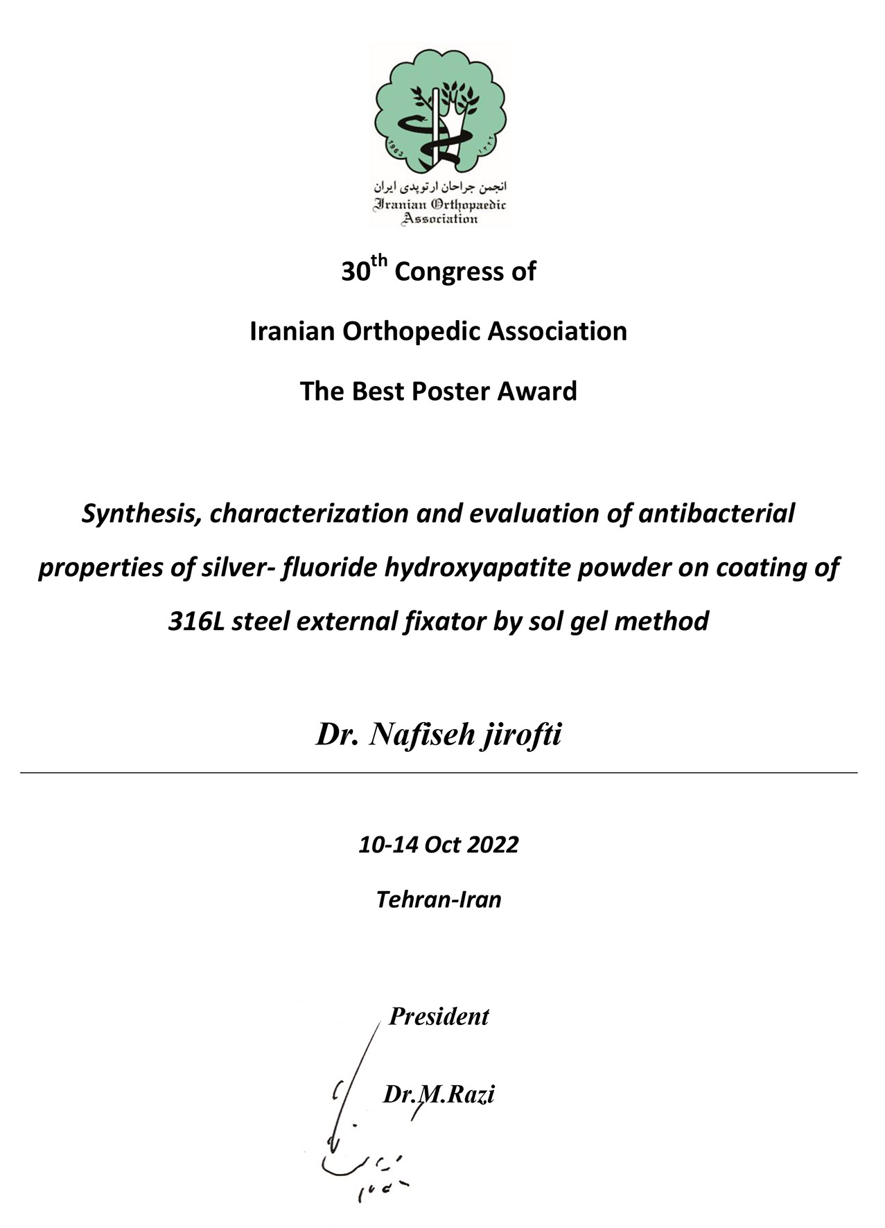 At the 30th Congress of the Iranian Orthopedic Association, held in Tehran, Iran from October 10-14 - 2022, Dr. Nafiseh Jirofti, a postdoctoral researcher from the Orthopedic Research Center (ORC) of Mashhad University of Medical Sciences, presented a poster titled: "Synthesis, Characterization, and Evaluation of the Antibacterial Properties of Silver-Fluoride Hydroxyapatite Powder on the Coating of 316L Steel External Fixator Using the Sol-Gel Method." This poster was recognized as the best presentation at the congress.